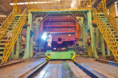 中國兵器工業集團一機集團北方創業公司生產線開足馬力生產鐵路車輛產品。日前,為圓滿完成1200臺C70E(H)型通用敞車生產任務,該公司不斷創新生產組織模式,新、舊兩條生產線全面啟動,白、夜班雙班組織生產,有效保障生產進度。(王磊 攝)